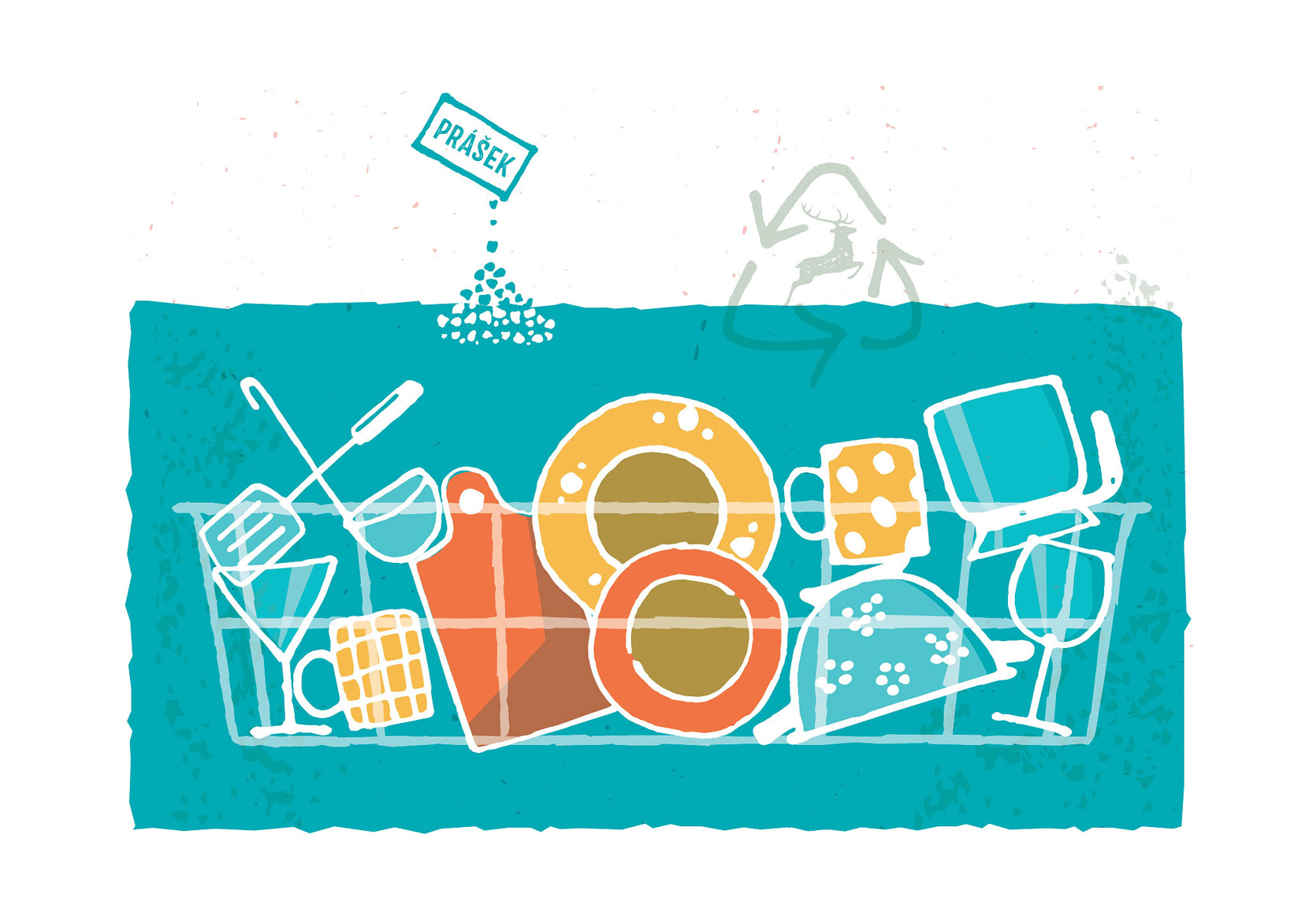 Výrazná stylizovaná ilustrace - dojem pohledu dovnitř myčky s čistým nádobím.